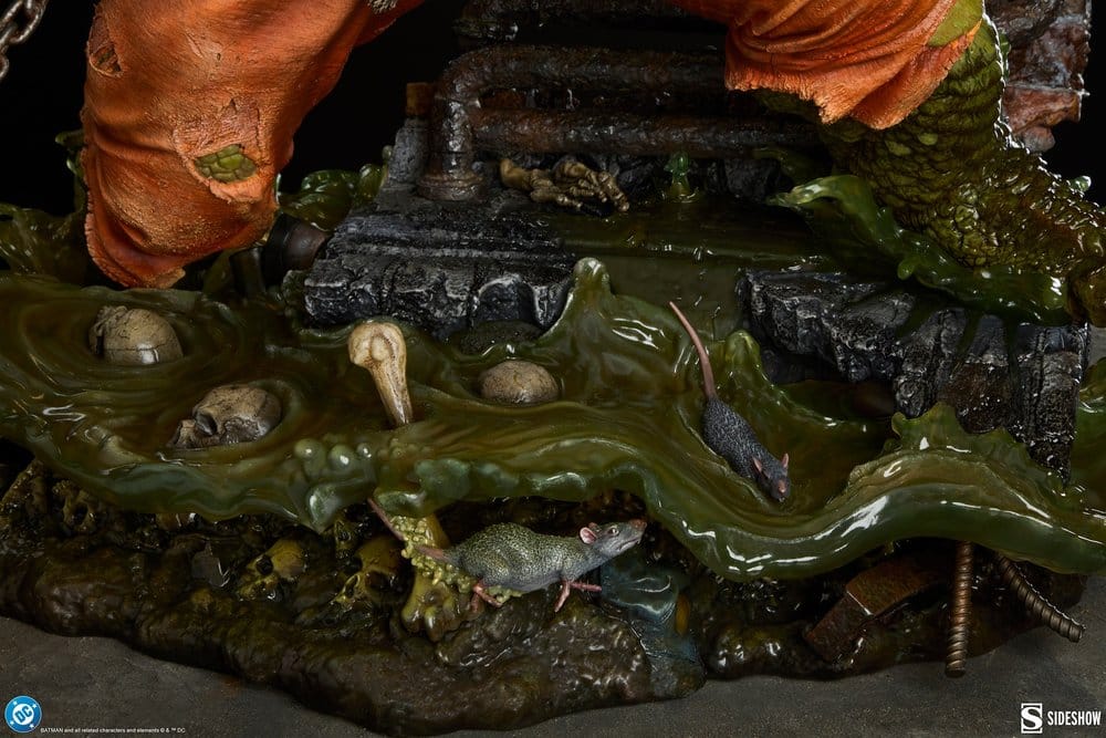 Inspiriert vom Comic-Auftritt der Figur zeigt diese detailreich modellierte Killer-Croc-Sammlerfigur ein Mitglied der Rogues Gallery in den Tiefen tierischer Verzweiflung. Als unübertroffener Schwimmer hat Killer Croc einige Andenken aus seinen Kämpfen gesammelt und sie dort versteckt, wo nur er und die Ratten sie erreichen können. Der äußerst detailreiche Sockel der DC-Statue enthält weitere Anspielungen auf seine Vergangenheit, wie Skelette und Banes Maske, die alle unter schwappendem grünem Wasser versinken. Zudem verweisen bedeutungsvolle Zahlen auf einem Kanalisationsschild auf wichtige Daten in Killer Crocs Veröffentlichungsgeschichte. Waylons Fesseln und zerrissene orangefarbene Hose deuten auf eine Flucht aus Arkham hin, das seine dicke Haut nicht bändigen konnte. Die Killer Croc Premium Format™-Figur enthält außerdem eine austauschbare rechte Hand, die ein Rohr hält.