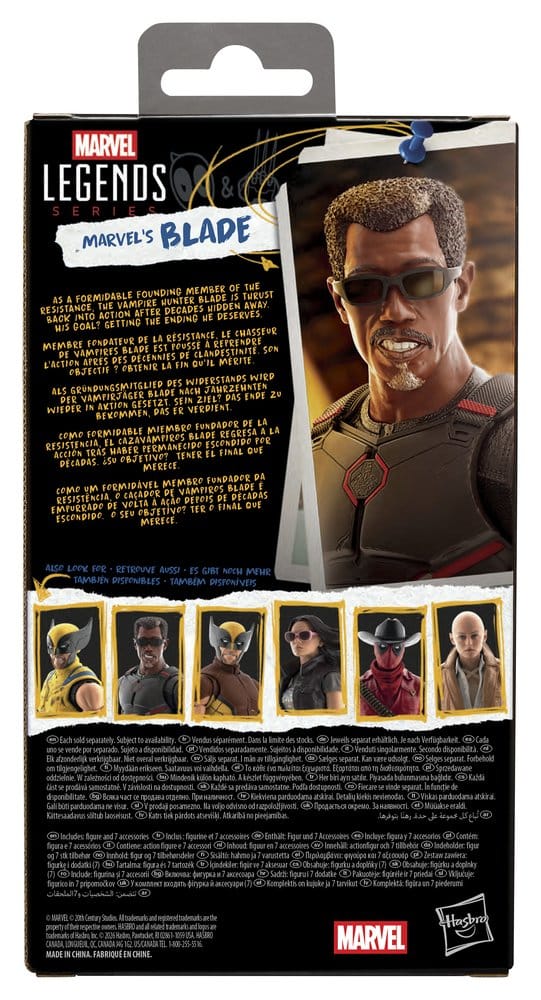 Mit der Marvel's Blade Action-Figur aus der Hasbro Marvel Legends Series kann die Spannung des Marvel Universums in der eigenen Sammlung zum Ausdruck gebracht werden. Diese sammelwürdige Marvel Figur (Skala 15 cm) ist dem Look des Charakters aus Marvel Studios' Deadpool & Wolverine nachempfunden.Die Marvel's Blade Figur ist vollbeweglich, beeindruckt mit einem Premium-Design und verfügt über einen beweglichen Kopf sowie bewegliche Arme und Beine. Das Marvel Action-Figurenset kommt mit 7 Accessoires, wie einem austauschbaren Kopf, 2 Sonnenbrillen, einem Satz austauschbarer Hände, einem Messer und einem Blaster. Hasbro Marvel Action-Figuren in einer Skala von 15 cm sind hervorragend geeignet, um sie in einer Fan-Kollektion zu präsentieren. Mit Marvel Legends Action-Figuren und Marvel Sammlerobjekten können die Szenen aus den Filmen zu Hause nachgestellt werden.